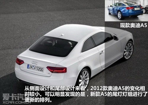 從側(cè)面設(shè)計(jì)和尾部設(shè)計(jì)來看,2012款?yuàn)W迪A5的變化相對(duì)較小??梢悦黠@發(fā)現(xiàn)的是,新款A(yù)5的尾燈燈組進(jìn)行了重新的排列,側(cè)身腰線及裙邊依舊維持著經(jīng)典的設(shè)計(jì)。其它方面,新的17英寸輪轂將成為新款A(yù)5的標(biāo)配,另外還可選裝20英寸輪轂。