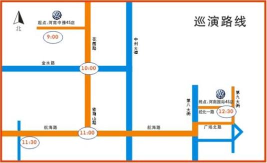 上午路線:進(jìn)口大眾河南中豫4S店——紫荊山路——航海路——進(jìn)口大眾河南中豫航海路展廳——進(jìn)口大眾河南國(guó)際4S店