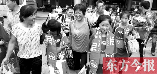 昨天下午3點(diǎn),在新鄭國(guó)際機(jī)場(chǎng)大廳等待已久的隊(duì)員家長(zhǎng)們,終于迎來(lái)臨潁縣女子足球隊(duì)的小隊(duì)員們。當(dāng)家長(zhǎng)們看見隊(duì)員從大廳里整齊走出來(lái),都圍了上去,紛紛念叨著“瘦了,黑了”。李女士說(shuō),大約有7名小隊(duì)員的家長(zhǎng)來(lái)鄭州接機(jī),幾乎所有的孩子河南省都沒(méi)出過(guò)。隨后,小隊(duì)員和家長(zhǎng)們陸續(xù)坐上了趕往河南建業(yè)球場(chǎng)的大巴。
