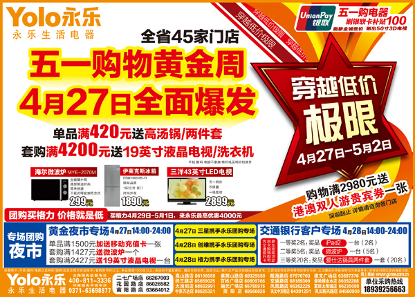據(jù)悉,今年五一,永樂電器向中外800多家電器廠家拋出30億規(guī)模的采購大單。借助于30億大單的規(guī)模優(yōu)勢,永樂將于4月27日發(fā)起五一黃金周降價潮,其中,彩電產(chǎn)品全場7折起,50英寸3D彩電價格更是首次降價幅度超過25%,合資品牌46英寸LED網(wǎng)絡(luò)電視跌破7000元,合資品牌三洋32英寸液晶電視僅售1699元;空調(diào)方面,格力、美的、海爾、志高、伊萊克斯、TCL、三洋等知名空調(diào)廠商的2012主打產(chǎn)品五一期間全部上陣永樂各大賣場,舉行大型特賣活動,使空調(diào)價格下降25%左右。1匹空調(diào)永樂五一最低降至2000元以下,而且不限量供應(yīng),更驚爆的還有一款1.5P的空調(diào)僅售價1999元,且大量供應(yīng)100臺;洗衣機(jī)價格平均降幅達(dá)30%,冰箱產(chǎn)品平均降幅也在30%以上,對開門冰箱首度跌破3500元。此外,廚衛(wèi)產(chǎn)品也將出現(xiàn)全年最大幅度的讓利優(yōu)惠,煙灶、熱水器等產(chǎn)品將以直降為主,購買套餐組合優(yōu)惠力度更大,方太經(jīng)典歐式煙灶套餐僅3700元左右,華帝廚衛(wèi)全場5折起,伊萊克斯電熱水器驚爆價999元;暢銷小家電也將大幅優(yōu)惠讓利。3C產(chǎn)品優(yōu)惠力度更大。其中HTC、索尼愛立信、諾基亞等品牌新品、暢銷品超低價銷售,千元智能手機(jī)大量供應(yīng);數(shù)碼產(chǎn)品方面,佳能、索尼、尼康、奧林巴斯、三星等品牌全面低價讓利,降價幅度高達(dá)20%。1200萬數(shù)碼相機(jī)跌破700元。最熱門的佳能600D單反數(shù)碼僅售5287元另加送多重禮品;同時,電腦產(chǎn)品也有不同程度的優(yōu)惠,戴爾2G內(nèi)存、500G硬盤、雙核處理器、獨立顯卡的筆記本電腦永樂專享價僅2999元。