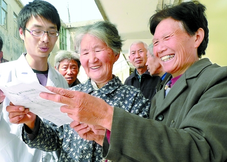 4月26日,湯陰縣白營鄉(xiāng)東木佛村老人們正在看自己的體檢報告。4月份,湯陰縣5萬多名60歲以上農(nóng)村老人享受到了一次免費(fèi)健康體檢,體檢費(fèi)用由政府買單。 常中正 攝