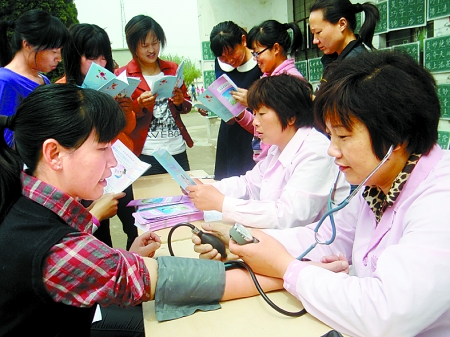 4月25日,商水縣舒莊鄉(xiāng)計(jì)生技術(shù)人員正在該鄉(xiāng)一中為教師進(jìn)行體檢?!拔逡弧鼻跋?,他們深入學(xué)校、機(jī)關(guān)、企業(yè)、田間,為辛勤工作在一線的廣大勞動者免費(fèi)進(jìn)行健康檢查,并發(fā)放醫(yī)療保健知識手冊。 喬連軍 攝