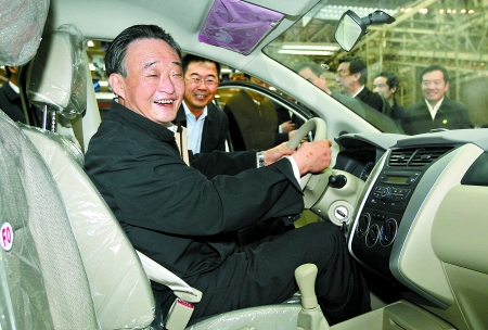 4月13日,中共中央政治局常委、全國人大常委會委員長吳邦國在東風(fēng)日產(chǎn)(鄭州)有限公司考察工作。圖為吳邦國委員長坐上一輛銀色樣車,查看車內(nèi)配置情況。 河南日報(bào)記者 郭 宇 李建峰 攝