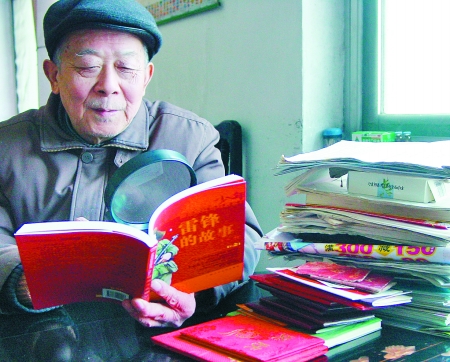 黃先知老人眼睛雖花了,仍每天堅(jiān)持借助放大鏡閱讀已看了無數(shù)遍的《雷鋒的故事》。