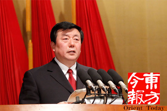 1月25日,河南省第十二屆人民代表大會(huì)第一次會(huì)議舉行了兩院報(bào)告會(huì)議。圖為檢察院院長(zhǎng)蔡寧在作報(bào)告 記者 沈翔圖
