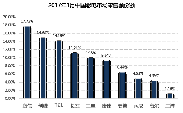 根據(jù)中怡康最新發(fā)布的2017年1月份月報統(tǒng)計數(shù)據(jù),海信電視零售量、零售額占有率分別達(dá)到16.7%和17.7%,雙雙高居中國彩電市場銷售量和銷售額占有率的第一位,其中銷售額占有率超出第二名2.79個百分點(diǎn).