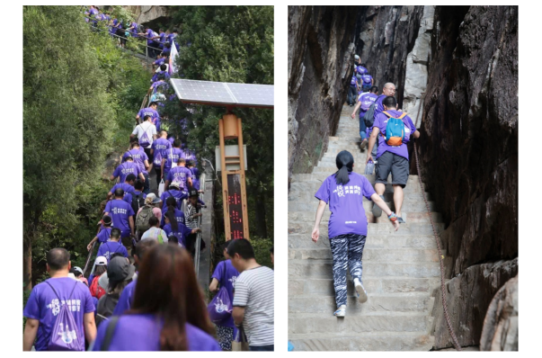 行至盧崖瀑布,泉水自山崖逐級跌落,聚水成潭,仿似人間仙境,令人流連忘返;稍事休整后,1000位登山者通過吊橋、一線天,沿途崖壁陡削,奇石林立。不少人已經(jīng)開始吃力,身強力壯的男士拉著女友的手一步一臺階地共同攀爬,稚嫩的孩童和爸爸媽媽一起,大手拉小手一邊說笑、暢享山水風光,一邊努力克服陡峭險阻的山路。到了峰頂,無論是浪漫的情侶還是幸福家庭,在群山之巔“一覽眾山小”,感悟真誠和熱情、信任與支持,體會共擔風雨的愛之真諦。
