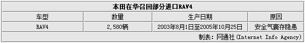 根據(jù)質(zhì)檢總局公布的消息,本次召回車型為豐田2003至2005款進(jìn)口的RAV4車型,其生產(chǎn)日期區(qū)間為2003年8月1日至2005年10月25日,共涉及2,580輛車。RAV4車型召回計(jì)劃將于2015年6月12日啟動(dòng)。屆時(shí)授權(quán)經(jīng)銷商將通過電話、短信等方式通知車主實(shí)施召回。召回車輛的原因是駕駛席所用安全氣囊氣體發(fā)生器存在氣密性不良的情況,長(zhǎng)期使用過程中可能出現(xiàn)大氣中水分進(jìn)入容器內(nèi)部,導(dǎo)致氣體發(fā)生劑吸濕后,空氣囊無法正常展開,增大駕駛員受傷的風(fēng)險(xiǎn),存在安全隱患。