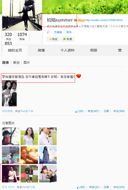 該微博也引起了不少熱心網(wǎng)友的注意,微博@麻辣婊哥懷疑@柏煊summer在刻意炒作,微博稱:“@柏煊summer 在周迅公布和高圣遠(yuǎn)的戀情后模仿發(fā)布微博,之后稱是朋友,居心叵測,個人簡介換得挺快的,不過得到關(guān)注已經(jīng)目的達(dá)到。不過話說回來,摟腰與共臥的行為也太過親密,絕非一般朋友,但周公子閱男無數(shù),此女威脅指數(shù)幾乎為零。 ”