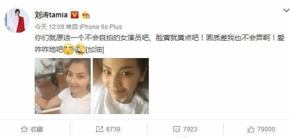 近期,劉濤在微博上面曬出了兩張照片,附文“你們就原諒一個(gè)不會(huì)自拍的女演員吧、臉黃就黃點(diǎn)吧!畫(huà)質(zhì)差我也不會(huì)弄啊!愛(ài)咋咋地吧”!