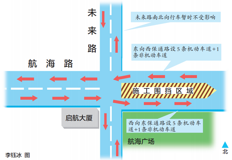 昨日,記者從交警四大隊(duì)了解到,隨著航海路一線地鐵5號(hào)線施工的推進(jìn),航海路未來(lái)路口即將開(kāi)始搭建新的圍擋進(jìn)行站體施工,25、26日進(jìn)行模擬實(shí)驗(yàn),27日正式圍擋。屆時(shí)航海路東西方向車(chē)輛將會(huì)改行到新修的保通路面,由雙向8車(chē)道減為雙向5車(chē)道。未來(lái)路南北方向車(chē)輛暫不受影響。