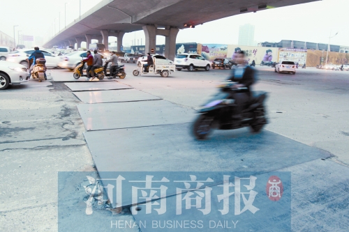 昨天下午,記者在現(xiàn)場(chǎng)看到,隴海高架橋黃河南路(西向東方向)下橋口南北兩側(cè),20余塊鋼板一字鋪開(kāi),鋼板路長(zhǎng)約50米、寬約2米,車(chē)輛經(jīng)過(guò)時(shí),鋼板與路面不斷發(fā)出沉悶的撞擊聲。