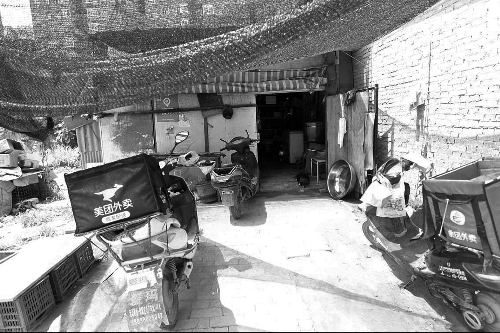 鄭先生所說的作坊,位于某高校東門對面不遠處的一座廢墟旁。如果不是在中午時分,店內(nèi)不斷傳出鍋勺碰撞的聲音和門口停著的幾輛后置送餐箱的電動車,很難注意到這個僅有10多平方米大小、由破舊的門板搭成的小屋是一家“飯店”。