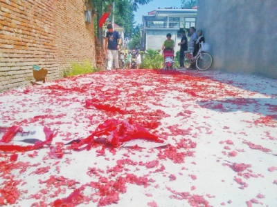 鄉(xiāng)親們燃放鞭炮,慶祝女排奪冠。