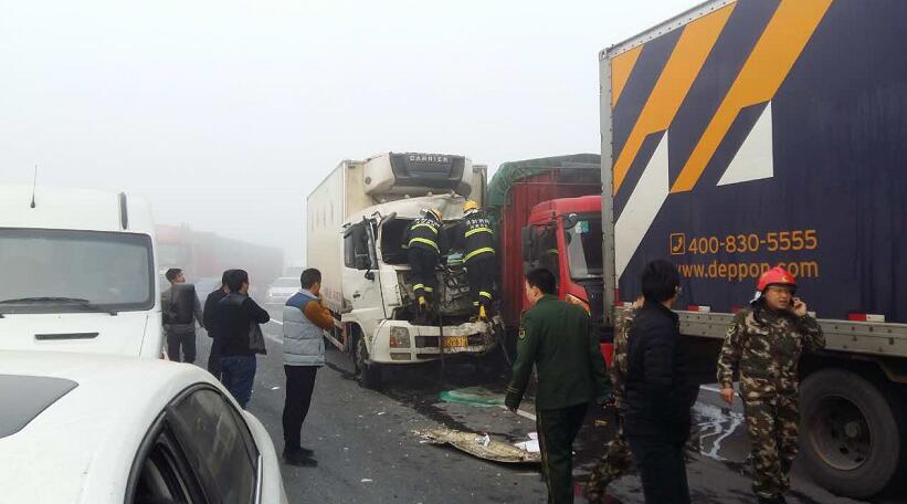 據(jù)現(xiàn)場郭先生描述:大概有4輛貨車,1輛中巴車,4輛私家車連環(huán)追尾,他就在這幾輛事故車后方,當(dāng)時受大霧影響,能見度50米左右,前方堵車,結(jié)果這幾輛車都沒剎住,直接相繼撞上了,郭先生說“幸虧當(dāng)時我車速不算快,及時把車剎住,不然前方就是一輛貨車,撞上去的話后果不堪設(shè)想,現(xiàn)在我的手都是抖的,太恐怖了”。