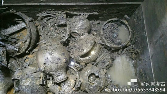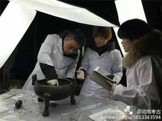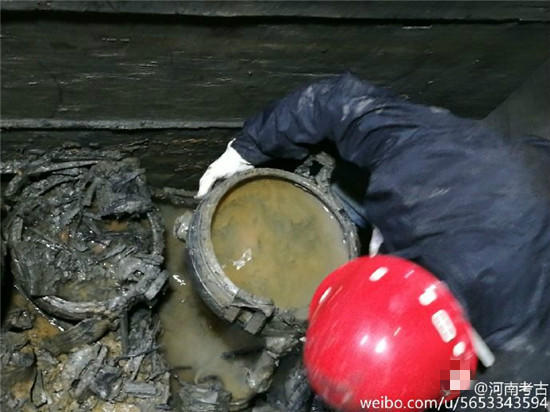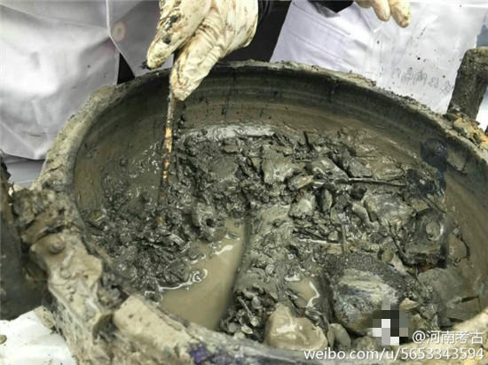 據(jù)@河南考古 微博消息,近日在河南一座古墓發(fā)掘現(xiàn)場,出土了幾只裝有“肉湯”大鼎,。