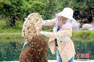 穿上防蜂服的工作人員從阮良明頭部緩緩倒下大量蜜蜂,沒過多久,阮良明整個頭部布滿密密麻麻的蜜蜂。 鄒海斌 攝