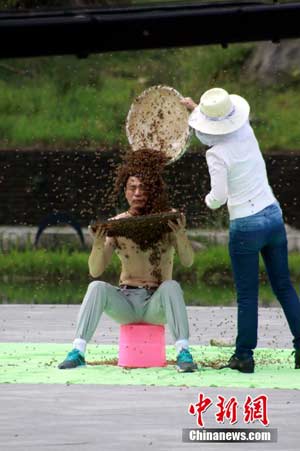 圖為江西“第一蜂人”阮良明靜坐挑戰(zhàn),上身已布滿密密麻麻的蜜蜂。鄒海斌 攝