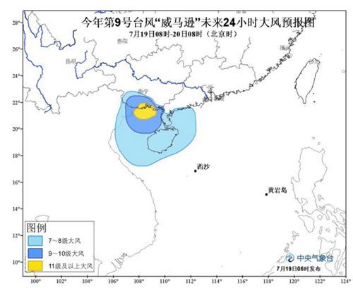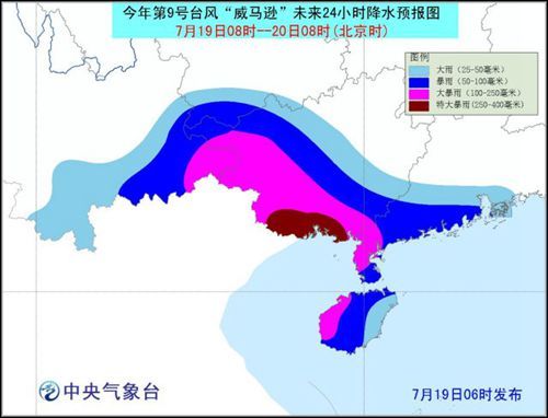 19日08時至20日08時,南海西北部、瓊州海峽、北部灣以及海南沿海、廣東西部沿海、廣西南部及沿海將有7-9級大風(fēng),其中北部灣北部、廣東雷州半島西部沿海、廣西沿海將有10-12級大風(fēng),臺風(fēng)中心經(jīng)過的附近海域或地區(qū)的風(fēng)力有13-15級,陣風(fēng)可達16-17級;海南大部、廣東西南部、廣西南部和西部、云南東南部等地有暴雨或大暴雨,其中,廣西南部等地的局部地區(qū)有特大暴雨(250-400毫米)。