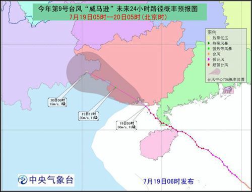 預(yù)計,“威馬遜”將以每小時20公里左右的速度繼續(xù)向西北方向移動,即將在廣西防城港附近沿海再次登陸,登陸強度可達15級(48-50米/秒),以后穿過廣西南部地區(qū),強度逐漸減弱。