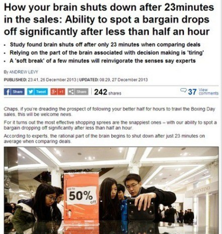 研究指出,一般人在購(gòu)物23分鐘后,大腦理性估價(jià)的能力就會(huì)下降,逐漸失去理智。只要一見特價(jià),就會(huì)立即進(jìn)入失心瘋狀態(tài)亂買東西!解決方法是可以每隔半小時(shí)停下來(lái)喝杯咖啡。。。