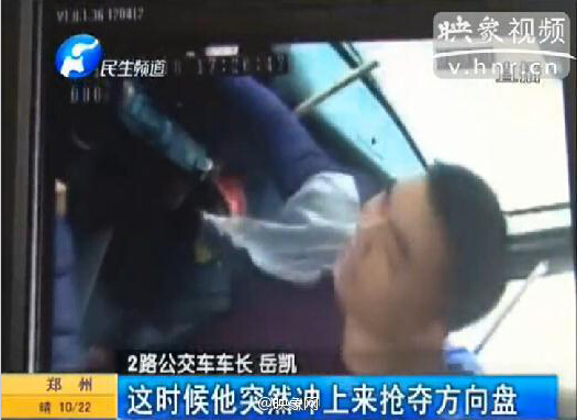 監(jiān)控顯示,鄭州2路公交車正常行駛中,突然一男子沖上來猛拉方向盤,并與公交車長廝打在一起。男子將車長狠狠地壓在方向盤上,無法動彈。而其動手的原因竟是因為坐過了站,車長沒有及時給他開門。事后,民警對此事進行了調解。