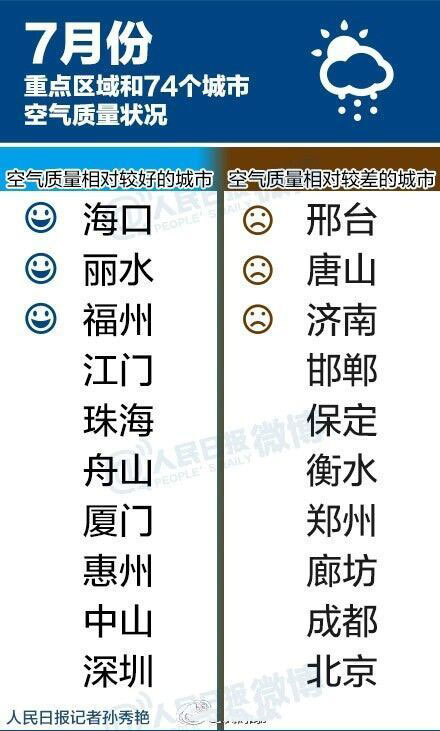 環(huán)保部今天發(fā)布7月城市空氣質(zhì)量狀況??諝赓|(zhì)量相對較差的后10位:邢臺、唐山、濟南、邯鄲、保定、衡水、鄭州、廊坊、成都和北京;空氣質(zhì)量相對較好的前10位:???、麗水、福州、江門、珠海、舟山、廈門、惠州、中山和深圳。
