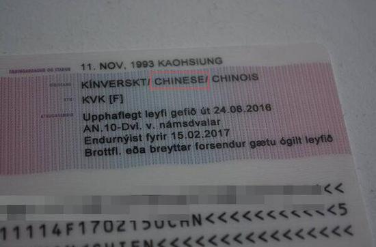 原標題:臺灣女生不滿冰島居留證被列中國籍 結果被改為“無國籍”