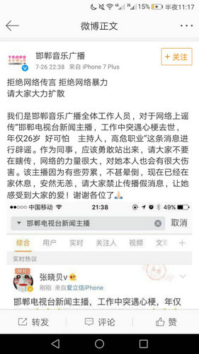 微博上暈倒的女主播為《邯鄲新聞》主播,在主持當(dāng)?shù)匾豁?xiàng)發(fā)布活動(dòng)時(shí)因勞累而暈倒在地,并被網(wǎng)友拍了視頻發(fā)在網(wǎng)上,稱其猝死。為此,彤彤特意發(fā)了一條朋友圈來(lái)辟謠,提醒大家不要傳謠以免給本人造成傷害。