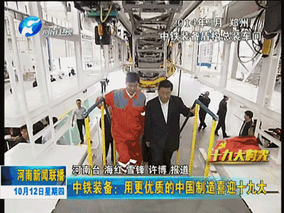 中國共產(chǎn)黨第十九次全國代表大會即將召開,今天起,河南新聞聯(lián)播推出《十九大時光》專欄,和您一起走進(jìn)革命老區(qū)、田間地頭、工礦企業(yè)、街道社區(qū),傾聽基層干部群眾愛黨愛國的熱切心聲,感受人們建設(shè)出彩中原的火熱場景,聚焦十九大召開的歷史性時刻,共度這段特殊而又美好的時光。今天播出第一集《中鐵裝備:用更優(yōu)質(zhì)的中國制造喜迎十九大》。
