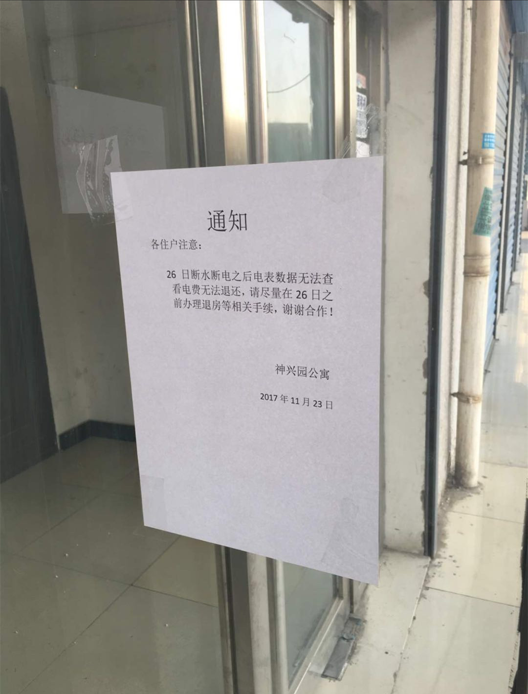 ?。ǜ鶕?jù)通州臺(tái)湖鎮(zhèn)政府下發(fā)的通知,亦園青年創(chuàng)業(yè)園周邊5家公寓應(yīng)于11月26日全面停水停電,圖為5家公寓之一的神興園公寓的通知 饒賢君/攝)