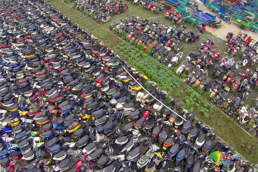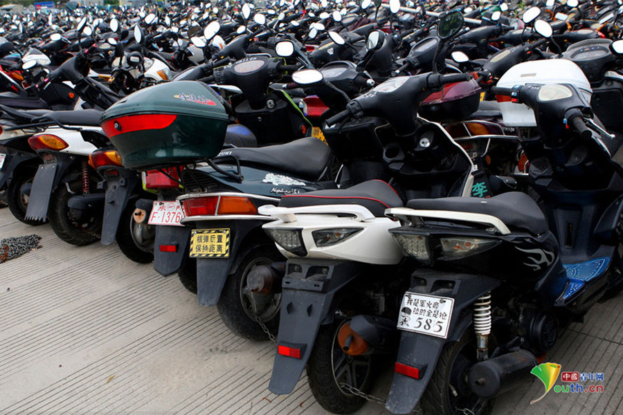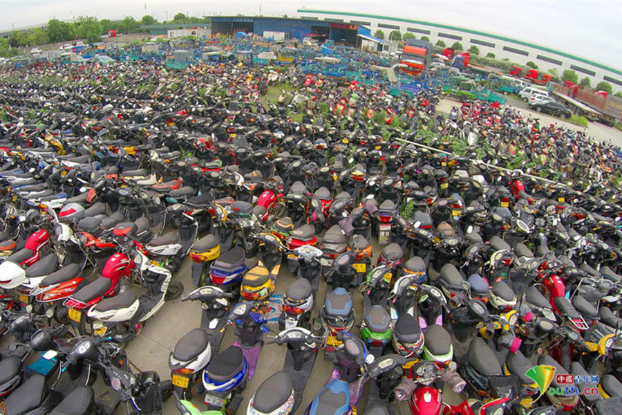 2015年6月4日,超寬、超速、非法營(yíng)運(yùn)三輪電摩及各種摩托車(chē)密密麻麻重重疊疊地堆積在一起,從高空中俯瞰場(chǎng)面震撼。這不只是杭州一家報(bào)廢車(chē)停車(chē)場(chǎng)的情景,幾乎每家停車(chē)場(chǎng)都如此。工作人員說(shuō),這都是交警執(zhí)法過(guò)程中收繳的。工作人員跟記者抱怨說(shuō),電摩停放時(shí)間太長(zhǎng),再不拆解都停不下了!據(jù)負(fù)責(zé)人介紹,杭州自禁摩托車(chē)以來(lái),總有一些違規(guī)者偷偷地利用摩托車(chē)充當(dāng)黑摩的。此舉既不安全,也暗藏各種不安全因素。2014年,杭州有204人死于涉及電瓶車(chē)的交通事故;在所有交通事故中,涉及電瓶車(chē)的占到四成以上。3月25日,有杭州媒體報(bào)道,杭州收繳的電動(dòng)車(chē)已堆滿(mǎn)停車(chē)場(chǎng),據(jù)估算馬路上還有百萬(wàn)輛以上超標(biāo)車(chē)。(金童子/攝)