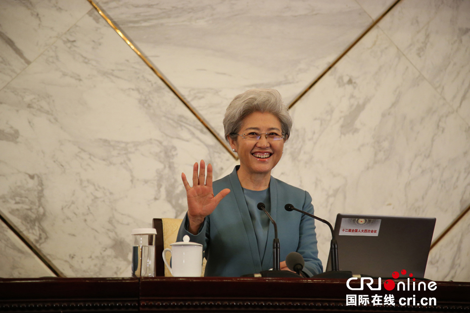 3月4日,全國人大發(fā)言人傅瑩面對(duì)記者揮手致意。