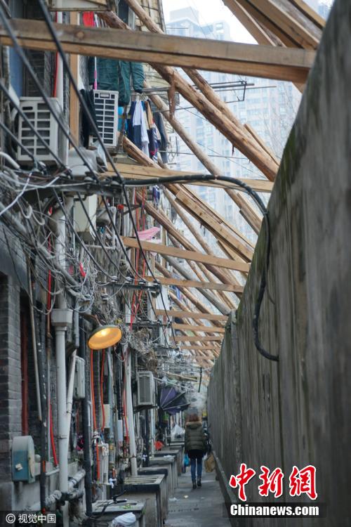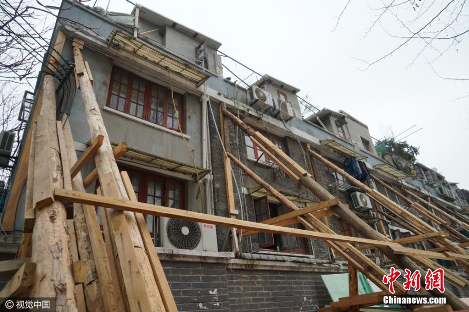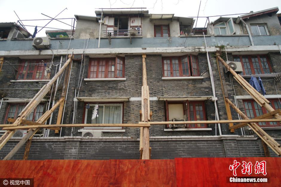 3月13日,上海黃浦區(qū),黃陂南路永年路一石庫(kù)門(mén)舊里房屋發(fā)生傾斜開(kāi)裂,外墻用數(shù)十根木棒進(jìn)行加固,場(chǎng)面十分壯觀,不少路人走過(guò)時(shí)都加快了腳步。據(jù)了解,此處房屋開(kāi)裂傾斜是由于相隔一條馬路的兩個(gè)建筑工地野蠻施工造成。此段居民小區(qū)為上世紀(jì)20年代建成的磚木結(jié)構(gòu)石庫(kù)門(mén)建筑,房齡至今已經(jīng)90余年,受影響的居民就多達(dá)幾十戶(hù)。 圖片來(lái)源:視覺(jué)中國(guó)