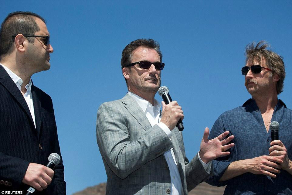圖中間是Hyperloop One公司CEO羅布-勞埃德,左右兩邊分別是Hyperloop One公司創(chuàng)始人舍文-皮許瓦爾和布羅根-班布羅根。他們?cè)诒崩咕S加斯超級(jí)高鐵推進(jìn)系統(tǒng)測(cè)試之后發(fā)表了講話。