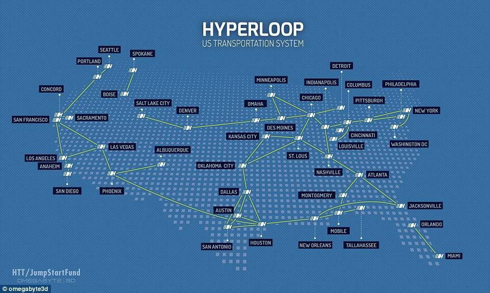 馬斯克在提出超級(jí)高鐵概念時(shí)曾說(shuō)它是協(xié)和式超音速噴射客機(jī)、軌道炮和空氣球臺(tái)的交叉結(jié)合,圖為HTT公司想架設(shè)超級(jí)高鐵的地區(qū)路線圖。