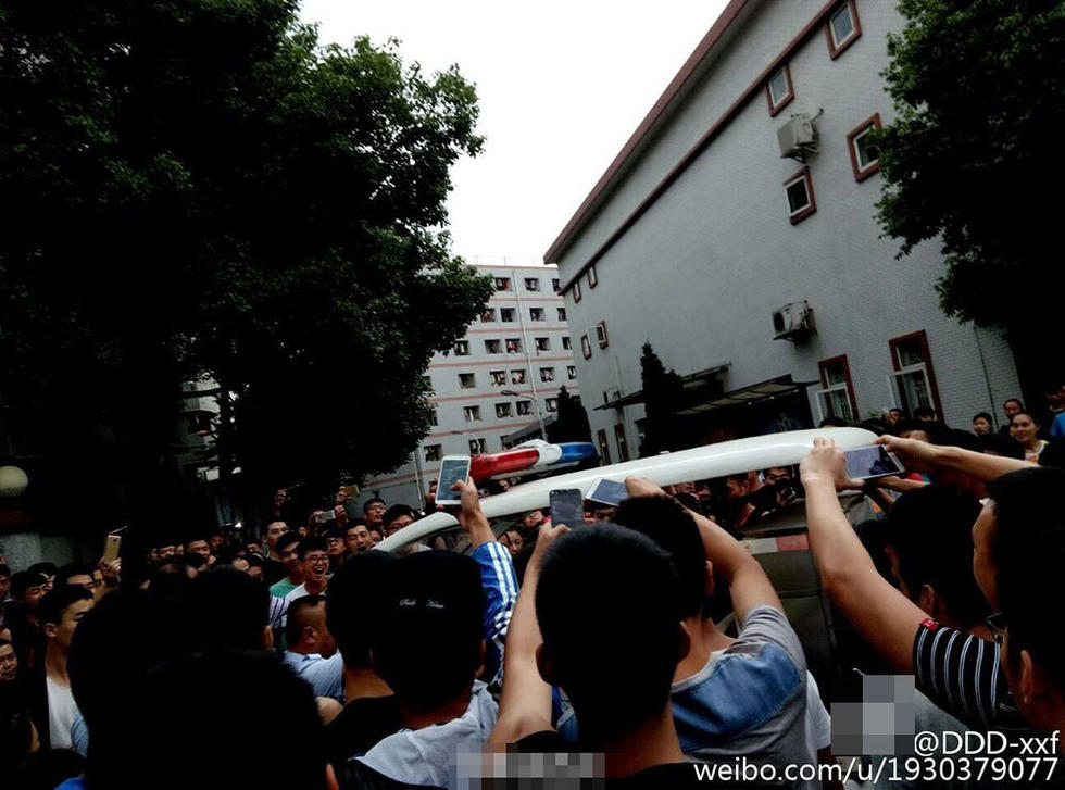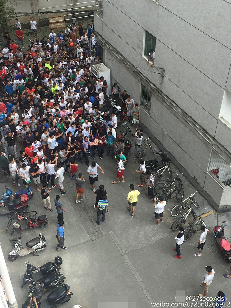 在小偷被攔下后,現(xiàn)場的喊聲驚動了更多路過的學(xué)生,不到半分鐘時間,兩棟樓內(nèi)的男生迅速跑下樓,現(xiàn)場近百名學(xué)生將小偷圍得水泄不通。