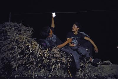 圖為5月12日晚上,村民坐在玉米稈上搜尋手機(jī)信號(hào),村里沒(méi)有發(fā)射塔,全靠山下發(fā)射到的微弱信號(hào)接收手機(jī)短信和打電話。9點(diǎn)多鐘,勒爾小學(xué)校長(zhǎng)吉克拉者帶著15個(gè)孩子到山下,其中有陳古吉的5個(gè)孩子,4個(gè)女孩1個(gè)男孩,最小的男孩叫陳木黑,6歲,讀學(xué)前班。爬山開(kāi)始前,陳木黑被陳古吉系上背包繩。前面由一個(gè)家長(zhǎng)引路,中間一個(gè)家長(zhǎng),陳古吉帶著陳木黑走最后,6歲的陳木黑已經(jīng)在這條路上,上上下下幾十次了。在爬垂直藤梯的時(shí)候,陳古吉會(huì)從后面微微提繩,讓兒子能夠省點(diǎn)力氣,跟上前面的哥哥姐姐。在通過(guò)沒(méi)有任何附著物的崖壁上的道路時(shí),陳古吉就格外小心,緊抓繩子的手有時(shí)青筋暴起。他說(shuō),前些日子,一個(gè)娃滑了一下,幸好崖邊的藤條擋住了,才撿回一條命。