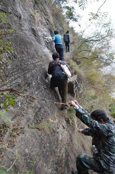 15個(gè)孩子中多數(shù)是女孩,在三個(gè)家長(zhǎng)的保護(hù)下,背著沉沉的書包,大約用了2個(gè)小時(shí),到達(dá)“懸崖村”。村里通向外界,需要順著懸崖斷續(xù)攀爬17條藤梯,其中接近村莊的幾乎垂直的兩條相連的藤梯長(zhǎng)度約100米,沒(méi)有藤梯的崖壁才是最危險(xiǎn)的。據(jù)支爾莫鄉(xiāng)黨委書記阿皮幾體講,他知道的在這條路上摔死的人有七八個(gè),有村里的人,也有外來(lái)的人,而摔傷的人更多。