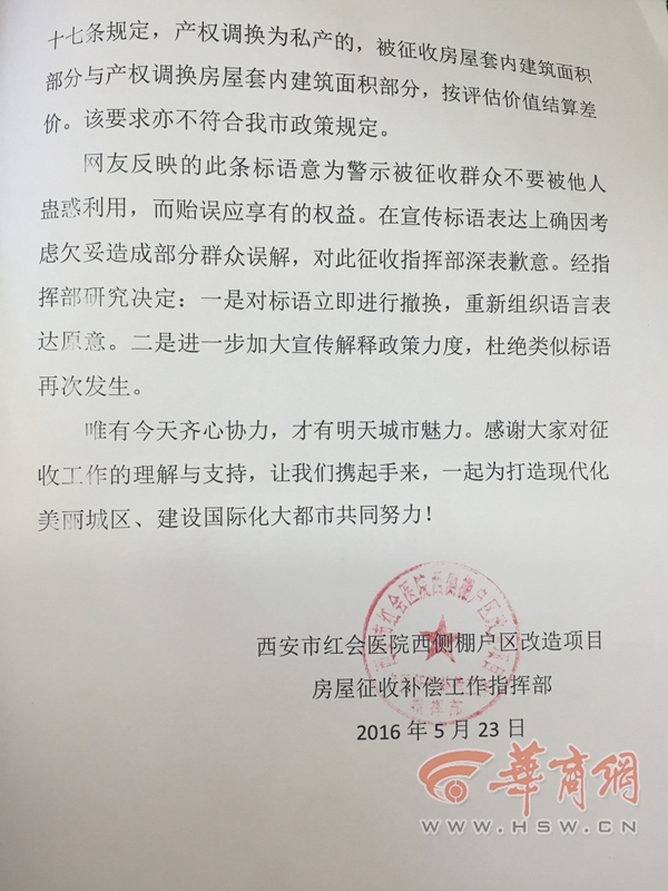 對于標(biāo)語上的用詞是否恰當(dāng)?劉組長表示,確實考慮欠妥造成部分群眾誤解,征收指揮部深表歉意。5月23日下午,已將標(biāo)語進行撤換,并重新制作新的標(biāo)語懸掛。