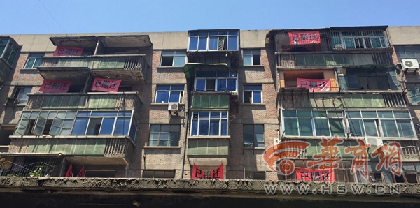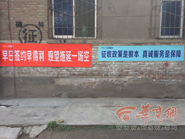 5月24日上午,華商網(wǎng)記者來到網(wǎng)友反映的紅會路附近,此處位于長安路沿線,共有四棟老式樓房面臨拆遷,居民樓的墻面上刷著黑色的“征”字,到處懸掛著拆遷宣傳橫幅。