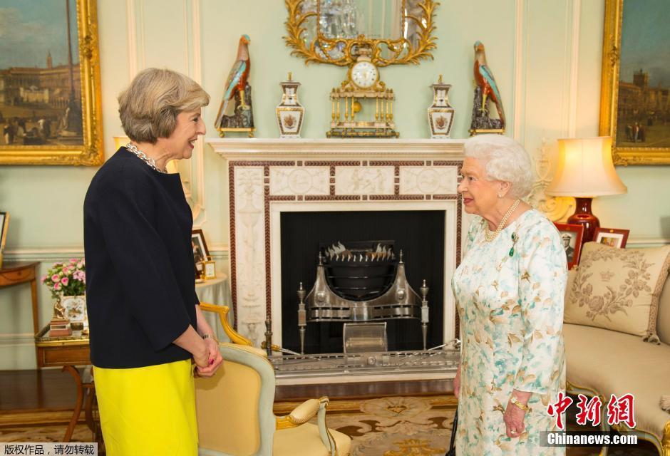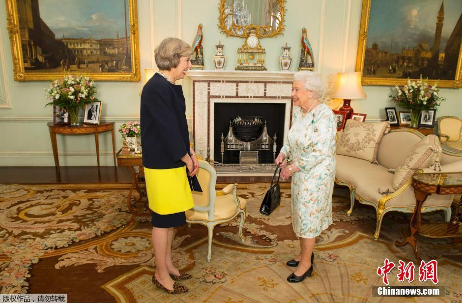 當(dāng)?shù)貢r(shí)間2016年7月13日,英國(guó)倫敦,英國(guó)女王伊麗莎白二世在白金漢宮接見特蕾莎·梅,并任命其為新首相。特蕾莎是英國(guó)女王伊麗莎白二世在位期間的第13任首相,同時(shí)也是繼撒切爾夫人后的第二位女首相。