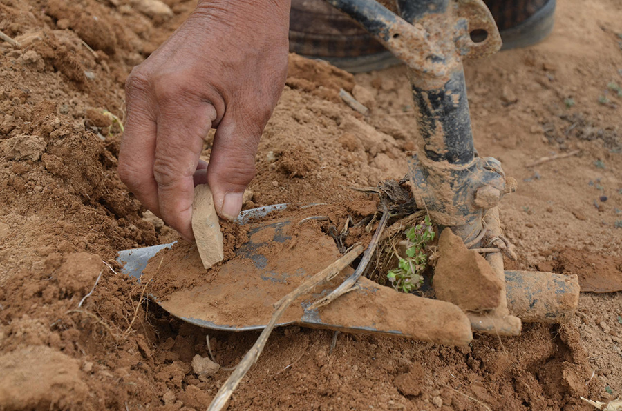 說是鋤,看起來又像犁,地里有墑,用一段就要用瓦片把泥土刮去,要不推起來就會費力,這個動作和鋤地一樣,鋤過地的都知道。