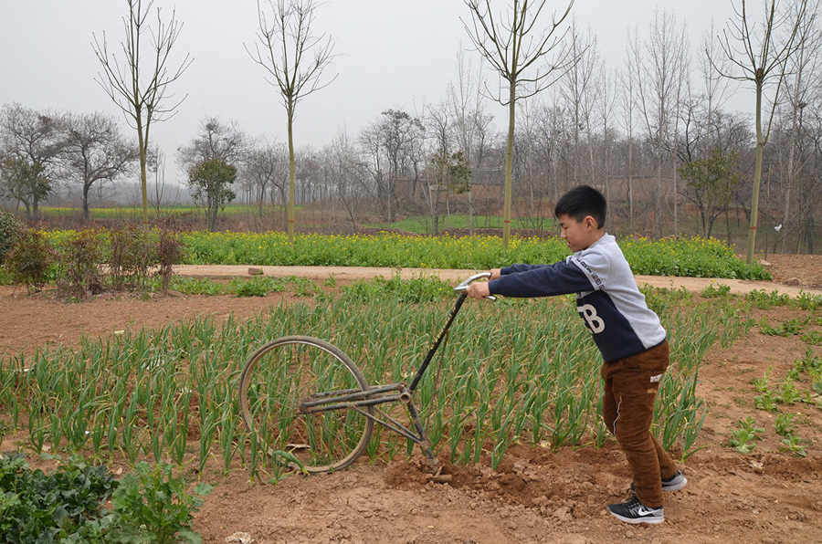 這種種菜的小地塊,推拖拉機過來翻有點兒擱不住,拿鋤頭鋤又有些費力,還好有這個神奇單車,連小孩子都能干活了。