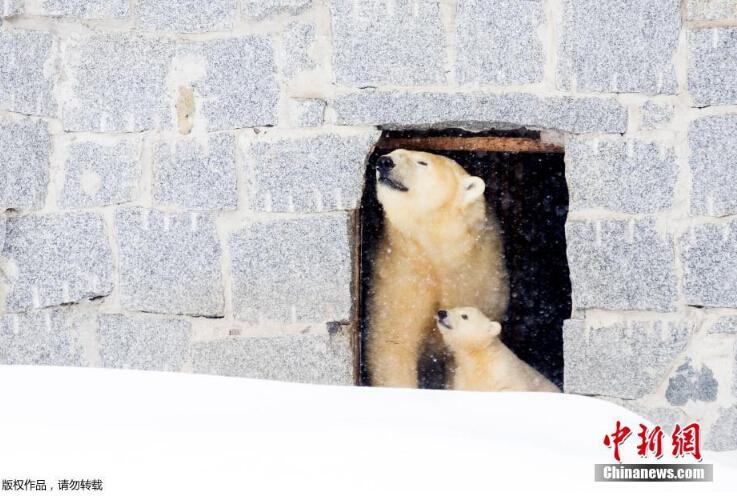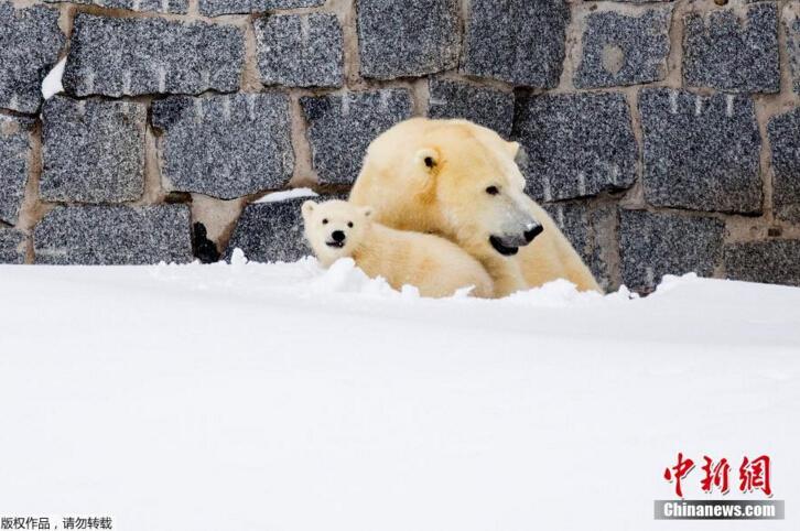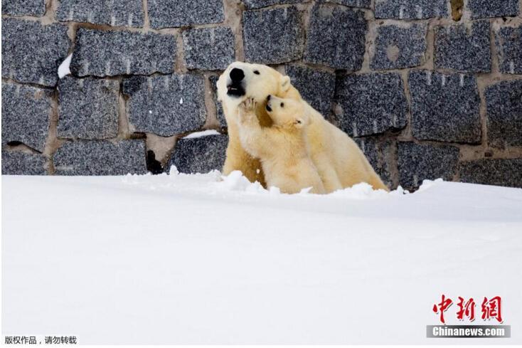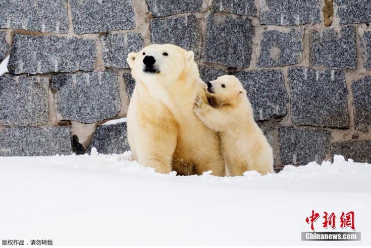 當(dāng)?shù)貢r(shí)間3月15日,芬蘭一野生動(dòng)物園內(nèi),北極熊母親帶著她的幼崽第一次在戶(hù)外亮相。小北極熊第一次在雪中玩耍,跟母親“求抱抱”。