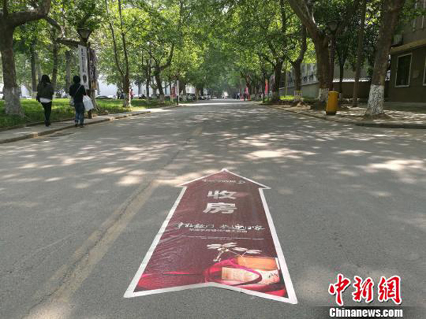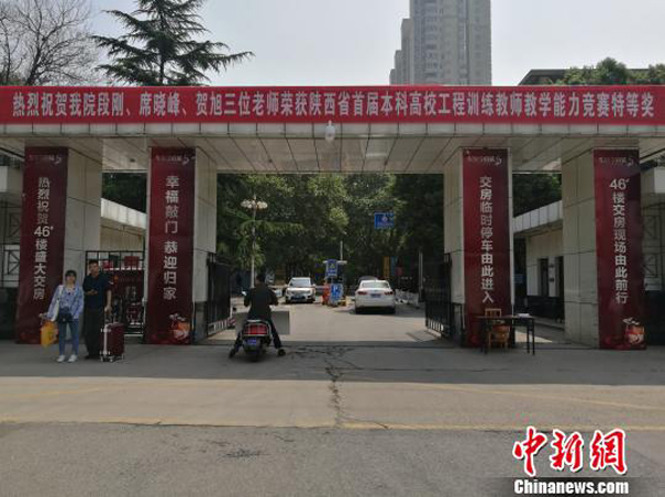 校園內(nèi)貼有收房指示路標(biāo)。記者4月27日在西安建筑科技大學(xué)華清學(xué)院看到,華清學(xué)府城與該校緊鄰,中間有一道門可以進出。樓盤交房廣告標(biāo)語張貼于學(xué)校大門的門柱上,寫有“交房臨時停車由此進入”、“46#樓交房現(xiàn)場由此前行”、“熱烈祝賀46#樓盛大交房”等標(biāo)示。