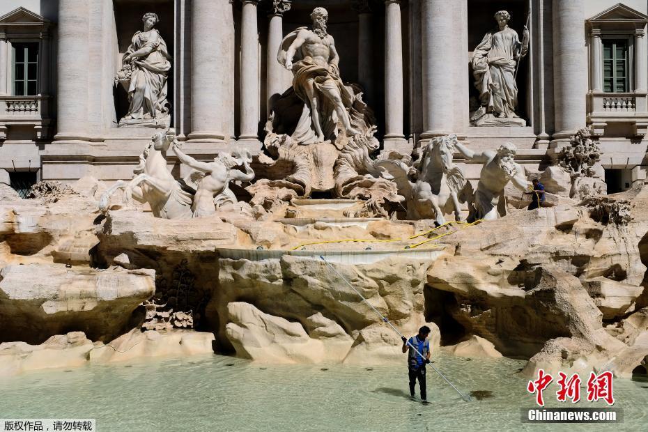 當(dāng)?shù)貢r間2017年5月2日,意大利羅馬,一名工人在特萊維噴泉里收集硬幣。每年從噴泉里收集到的硬幣大約價值100萬歐元。