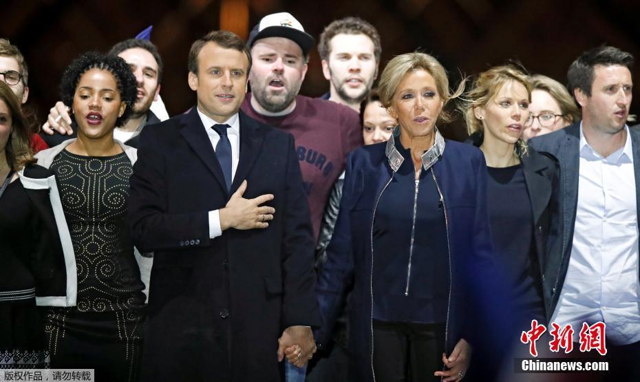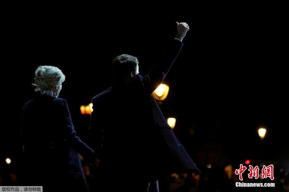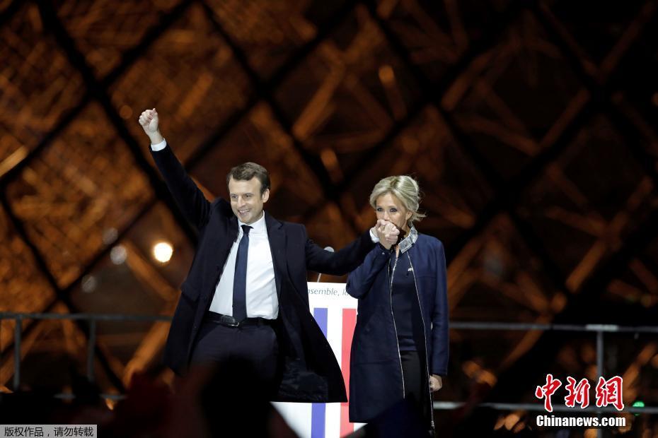 巴黎時間5月7日晚,法國總統(tǒng)選舉第二輪投票初步計(jì)票結(jié)果顯示,中間派獨(dú)立候選人、“前進(jìn)”運(yùn)動領(lǐng)導(dǎo)人埃馬紐埃爾·馬克龍以大幅優(yōu)勢擊敗極右翼政黨“國民陣線”候選人馬麗娜·勒龐。年僅39歲的馬克龍由此成為法國史上最年輕的總統(tǒng),也成為世界上最年輕的大國領(lǐng)導(dǎo)人。圖為馬克龍(左二)和妻子布麗吉特(右二)在慶祝勝選的集會上向支持者致意。中新社記者 龍劍武 攝
