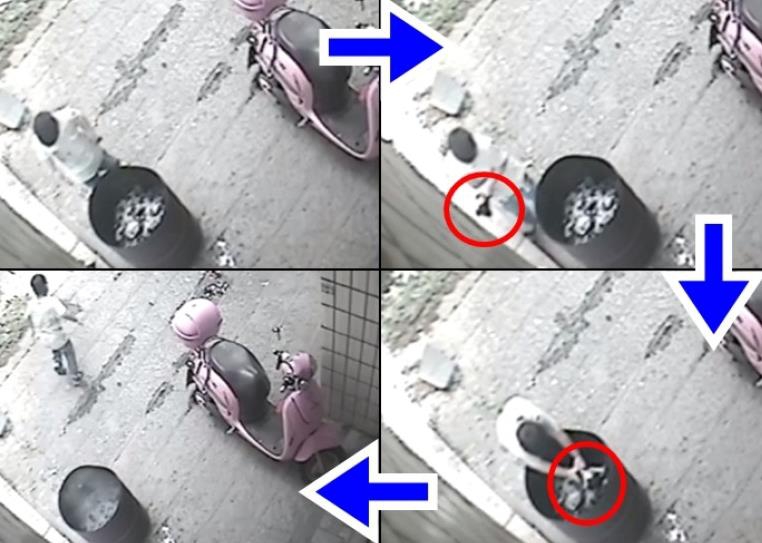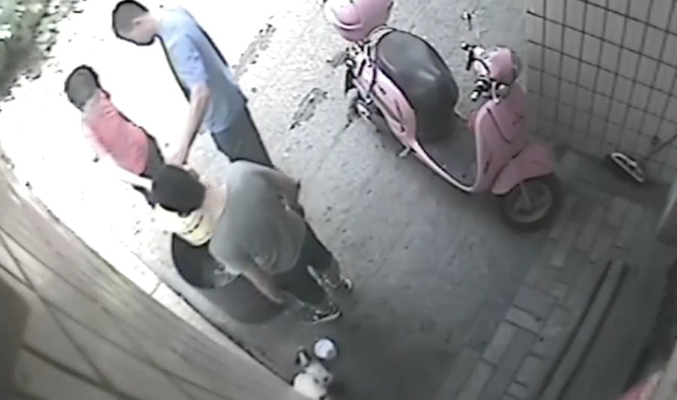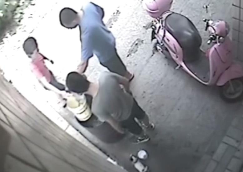 “然后我們以為那個(gè)小狗,那個(gè)桶那么高,它怎么能跳進(jìn)去。然后我們就調(diào)監(jiān)控,發(fā)現(xiàn)是鄰居家小孩做的?!眻D為男童抓起小狗將其扔進(jìn)火盆。