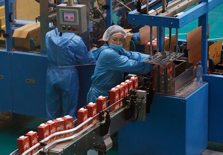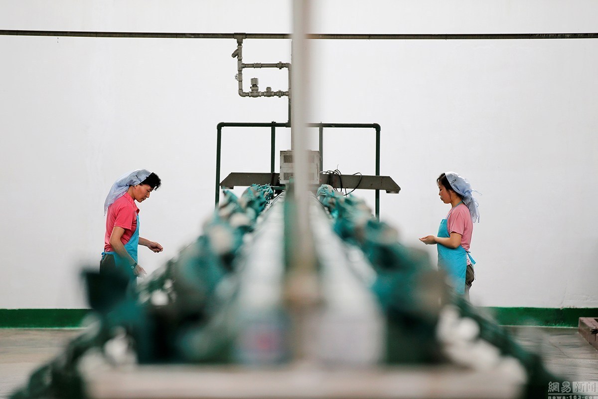 工人在一家工廠的果汁生產(chǎn)線進(jìn)行操作,這附近的Daedonggang水果農(nóng)場(chǎng)坐落在平壤郊區(qū),擁有125公頃的蘋果樹。